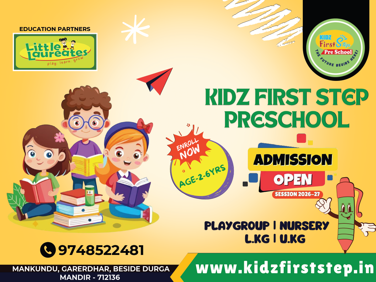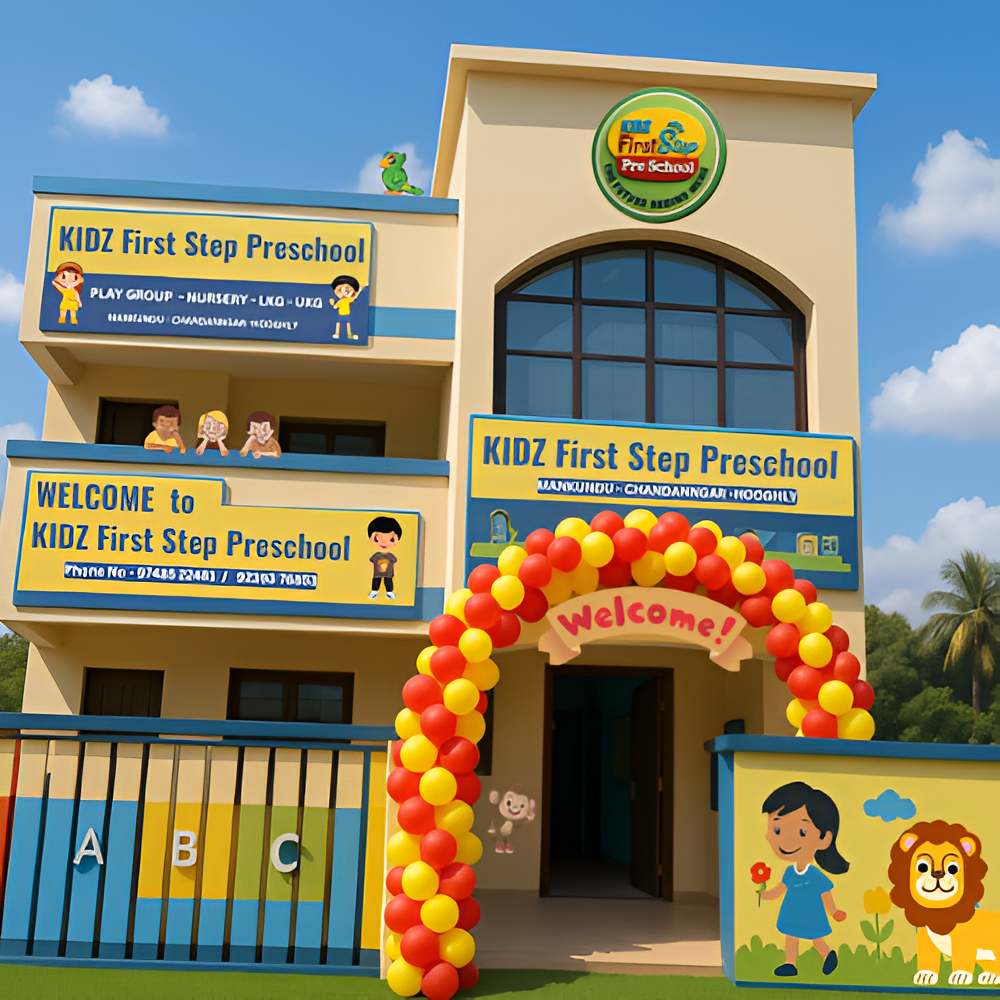 KIDZ FIRST STEP PRESCHOOL- THE FUTURE BEGINS HERE, is the perfect second home for the kids aged 2years to 6 years. Our unique pedagogy, ENRICH follows the ECCE approach and aligns with NEP 2020 & NCF 2022-2023 guidelines, making education scientific, interactive and enjoyable for kids. We emphasized holistic development nurturing each child into a confident competent and smart individual. At KIDZ FIRST STEP, children embark on a journey of PLAY, LEARN and GROW method, exploring a world of knowledge and creativity. We are recognised as the best preschool in Mankundu and Chandannagar, committed to providing a strong foundation for young learners.
